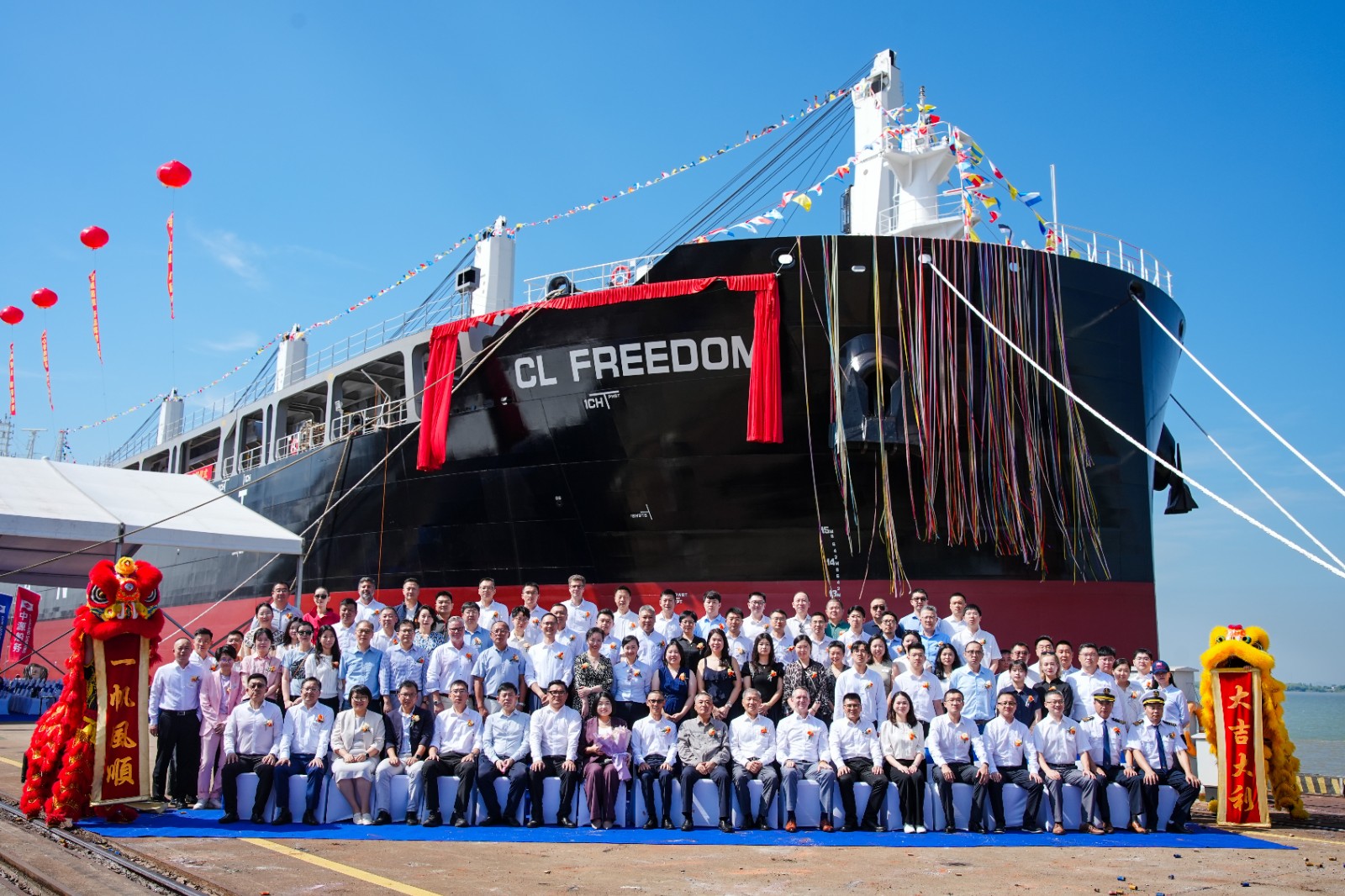 2025年8月26日,江苏泰州口岸船舶有限公司码头彩旗飘扬、舞狮欢腾,中源船务6.2万载重吨多用途重吊船系列首制船 “自由轮(CL FREEDOM)”成功命名交付。
